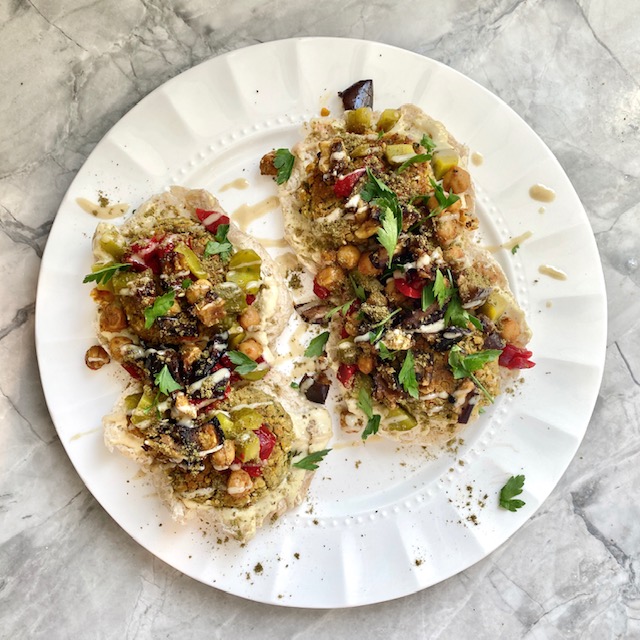 Directions: Drain and rinse chickpeas. Lay on a kitchen towel to completely dry. In the meantime, add garlic and shallot to food processor. Pulse to mince. Next add in remaining ingredients, except for oil. Pulse – do not let it become a paste. It should look crumbly but you should be able to squish it in your hands to form a patty and it should maintain the shape. Transfer to a bowl and refrigerate for an hour. Preheat oven to 375°F. Pour oil onto a baking sheet and carefully place into oven while oven is preheating (preferably on a rack that slides out). Once preheated, wait an additional 5 minutes before adding the patties to the pan. In the meantime, form falafel mixture into individual patties (using about 2 tbsp per patty). Very carefully, open the oven and slide rack out. Drop patties into oil and return to oven. Bake for 15 minutes and then flip for an additional 15 minutes.