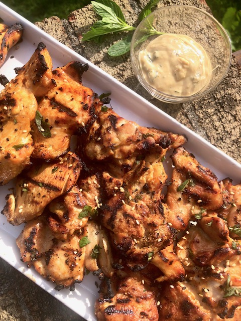 Mix ginger, garlic, soy sauce, lime juice, maple syrup, sesame oil and 1 tbsp mint. Pour over chicken and let marinate for about an hour. Grill and enjoy! .