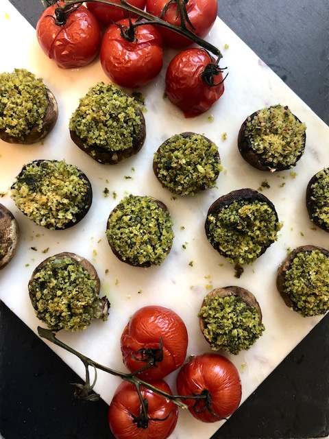 Mix pesto and panko together and fill each mushroom with the mixture.