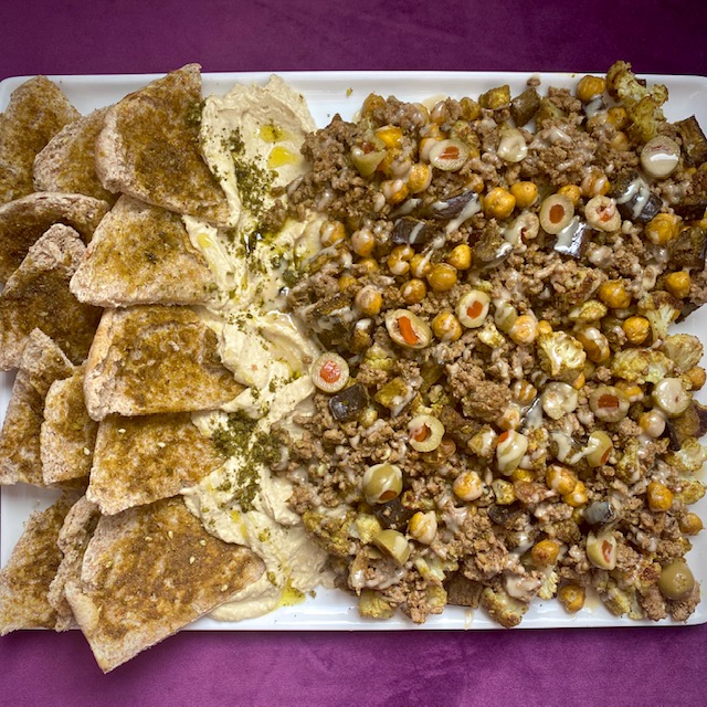 Ingredients: 1 lb ground beef (or lamb) 1/2 eggplant, cubed 1/2 cauliflower, cut into small florets 1/2 can chickpeas, drained and dried 2 cloves garlic, minced 2 tbsp shawarma seasoning; divided 2 tbsp zaatar, divided 1 tsp sea salt 1/4 cup extra virgin olive oil Pepper to taste Pita chips (store bought or homemade) Humus Sliced olives if desired