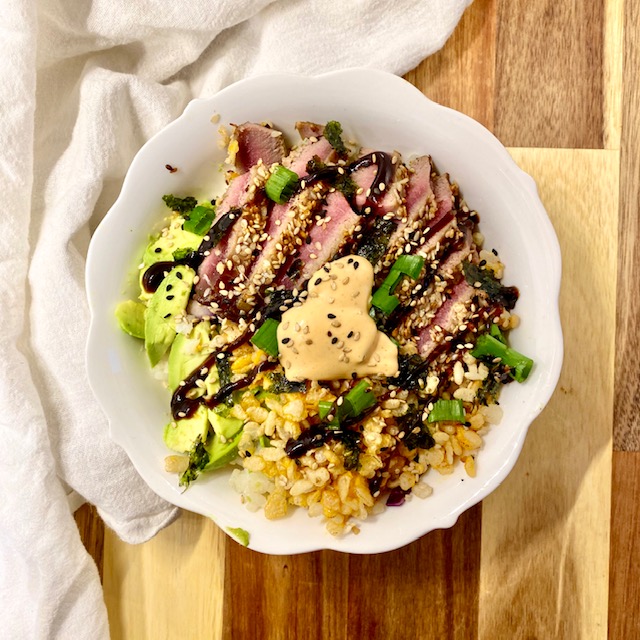 The tuna in this recipe is inspired by @bowlofdelicious seared tuna.