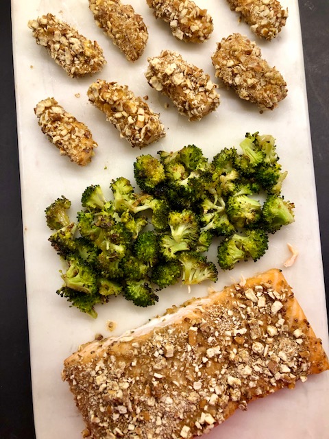 Directions: Preheat oven to 400°F For fish sticks: Mix together maple syrup and mustard. You can add a bit of mayo to this mixture if you’d like. Dredge salmon in flour. Then coat with mixture of mustard and maple. Finally dip in crushed pretzels. Spray generously with non stick cooking spray. Bake for 10 minutes. . For salmon filet and broccoli: Mix together maple syrup and mustard. Spread half of mixture onto salmon. Mix remaining mixture with oil and coat broccoli. Generously sprinkle salmon with crushed pretzels. Bake for 15-20 minutes, depending on thickness of salmon.