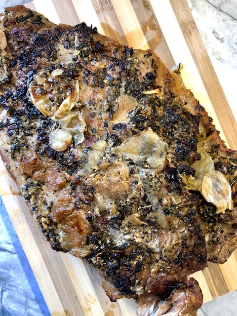 Directions: Mix all ingredients for marinade together and pour over London broil. Allow to marinate for at least 2 hours up to overnight. Preheat oven to 400°F – be sure it is ready for London broil before you start grilling. In the meantime, heat a grill pan, coated with a bit of oil, to medium-high heat. Remove meat from marinade (reserving it for later). Grill the London broil for 3 minutes per side. Transfer meat to an oven safe dish and pour marinade back on. Bake uncovered for 15-20 minutes. I cooked my London broil in a cast iron skillet and put it straight into the oven like that. The cooking method for the meat comes from, @kimkushercuisine ‘s first cookbook, The Modern Menu.