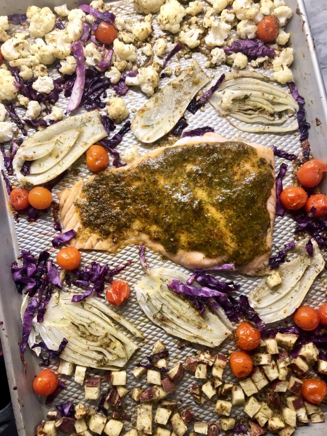 Bake for 15 minutes. Remove from oven and add fake bacon and purple cabbage to the tray. Bake for and additional 15 minutes.