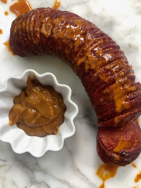 1 large salami 2 heaping tbsp honeycup mustard 1 tbsp smoked paprika ~1 tsp maple syrup (adjust according to your sweetness preferences) Water to thin. . Preheat oven to 400°F. Put 1 chopstick on either side of salami to keep in place and to avoid being able to but all the way through. Thank you @busyinbrooklyn for this tip. Slice salami into super thin rounds but don’t cut all the way through (that’s why the chopsticks are there). Place salami in a greased baking dish. Mix together honeycup mustard, smoky paprika and maple syrup. Add water to thin so it’s easier to drizzle. Brush onto salami, making sure to get into all the crevices. Bake uncovered for about 45 minutes, basting every 15 minutes or so.