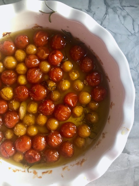 Cherry Tomatoes Golden berries A few sprigs fresh rosemary 4 cloves garlic Extra virgin olive oil Freshly ground pepper and sea salt . Golden berries, otherwise known as physalis (I grew up calling them paper tomatoes) are delicious, sweet and tart. They add a delicious tang to this traditional confit. . In an oven safe dish, place a handful each of cherry tomatoes and golden berries in a single layer. Add the garlic and rosemary. Pour on oil until it’s halfway up the tomatoes. Top with salt and pepper. Bake uncovered at 250°F for 2 hours.
