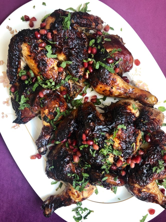 This recipe is inspired by a chicken recipe by @susiefishbein kosher by design and by a recipe I printed a long time ago but I have no idea where it’s from. . 2 whole chickens, spatchcocked 2 cups pomegranate syrup or silan 2 cups red wine 8 cloves garlic, pressed through a garlic press 1/4 cup mint, chopped Freshly ground pepper . Zest of 1 lemon 2 tbsp pomegranate seeds 1-2 tbsp extra virgin olive oil 2 tbsp chopped fresh mint . Garnish – mint and pomegranate seeds . Place chicken in ziplock bag or large baking dish (skin side down). Mix together pomegranate syrup, red wine, garlic, mint and pepper. Pour marinade over chicken. Let marinate overnight. . Preheat oven to 450°F convection (475° if you don’t have a convection oven). Remove chicken from marinade and place in baking dish (preferably with low edges). Place marinade into a pot and boil at medium heat for at least 30 minutes. Mix together lemon zest, pomegranate seeds, oil and mint. Stuff under the skin of the chicken. Bake for 20 minutes, until nicely browned. Reduce heat to 350°F convection (or 375°F) and bake for another 20 minutes. Always use a meat thermometer to check if chicken is cooked through. Garnish with pomegranate seeds and mint. Serve boiled down marinade alongside chicken as a dipping sauce. This chicken does not freeze well. . @faigysfood made this recipe but added the boiled down marinade as a glaze to the chicken while cooking – great idea!!!