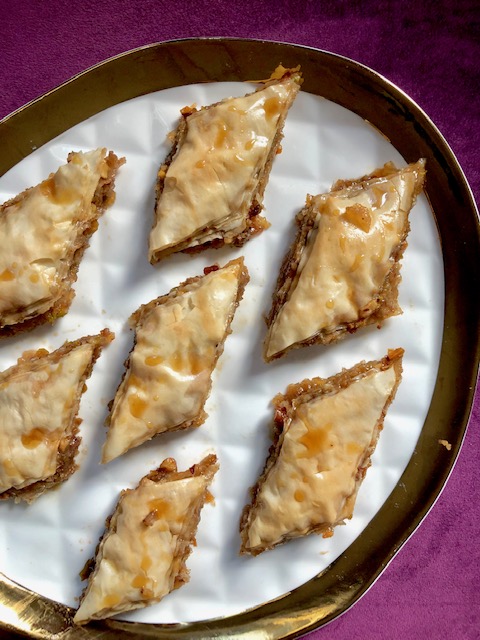 3/4 cup mixed pecans and pistachios, chopped into small pieces 1/4 cup brown sugar 1/2 cup silan, divided 1/4 cup honey 1 tsp cinnamon 3 apples, peeled, cored and chopped into tiny pieces 16 sheets phyllo dough 1/2 cup coconut oil, melted . Preheat oven to 350°F. In a bowl, mix together pecans, pistachios, brown sugar, 1/4 cup silan, honey, cinnamon and apples. . Cut your phyllo sheets to the size of your pan. I used a 9×9 square pan. Keep phyllo covered with damp towel when not in use. . Brush the bottom of the pan with coconut oil. Layer 1 sheet of phyllo and brush with coconut oil. Layer 2 more sheets of phyllo, brushing with oil after each one. Spread 1/3 of apple nut mixture onto phyllo. . Layer 3 more sheets of phyllo and brush coconut oil after each layer. Spread 1/3 of apple nut mixture onto phyllo. Repeat. Top with 4 phyllo sheets, with brushed coconut oil after each layer. . Cut 4 or 5 parallel lines through the baklava. Then cut lines on a diagonal. This will form a diamond shape. . Bake for about 45 minutes, until the top is nice and golden. Immediately, pour remaining silan over the baklava. Allow to cool completely before serving or covering.