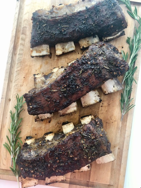3 kg rack of beef short ribs 1/3 cup Trader Joe’s coffee rub (for a copycat coffee rub, check out this recipe from Cooking with Tantrums https://cookingwithtantrums.com/2016/07/coffee-garlic-rub/ ) 4 cloves garlic 1 tbsp maple syrup 1 tsp dry mustard (omit for passover) Handful chopped fresh rosemary Fresh ground pepper . Mix together all ingredients except meat to form a rub and spread over beef. Bake uncovered at 375°F convection for 30 minutes Then 250°F non convection covered for 2 hours Serve topped with sauce from pan.